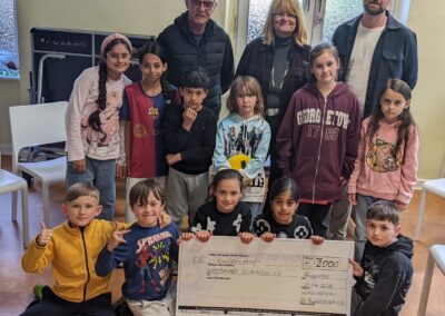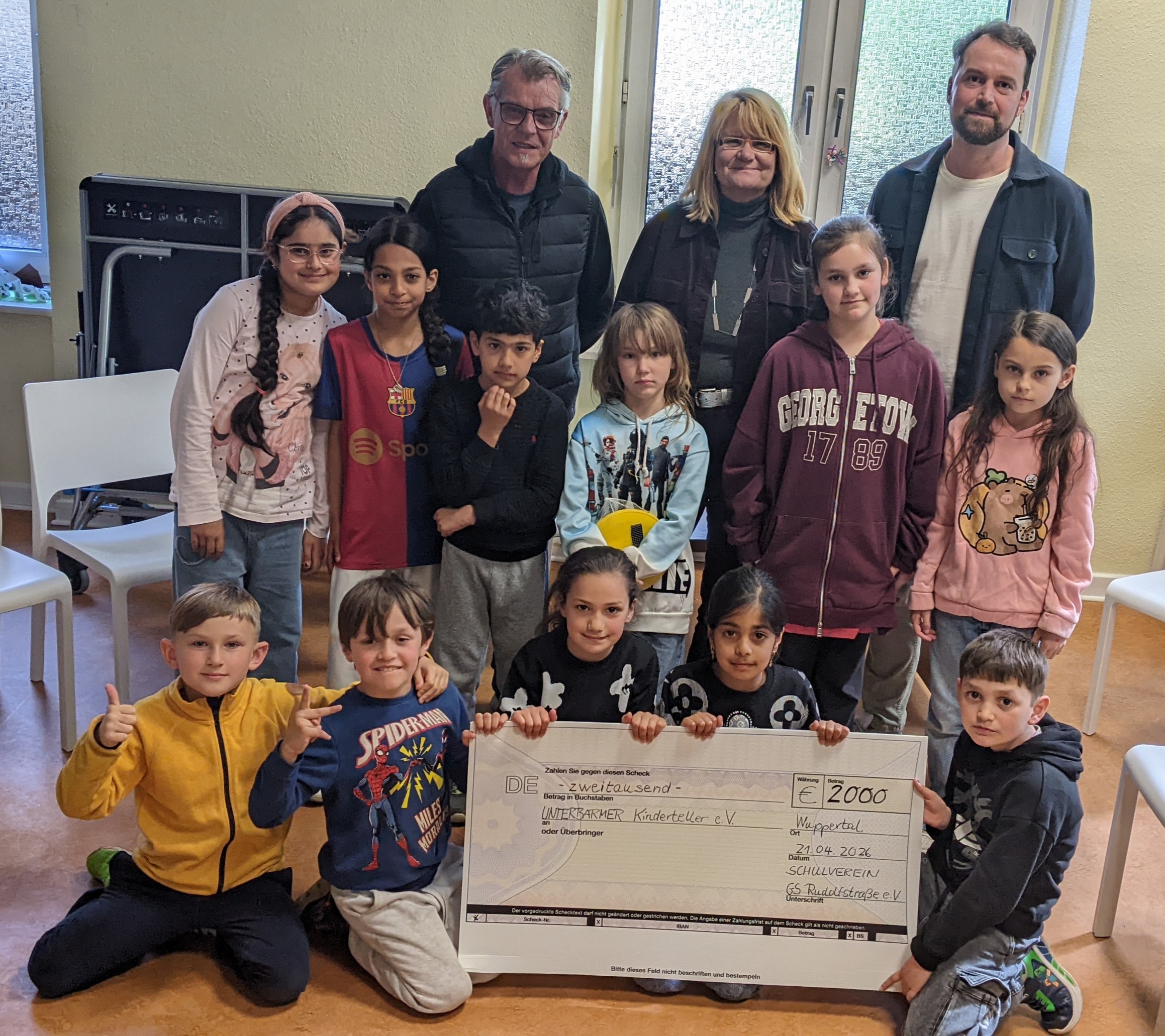Am Dienstag, den 21. April, war es dann soweit. Es erfolgte die Scheckübergabe eines Schecks in Höhe von 2000 Euro vom Schulverein der Grundschule Rudolfstraße an den Unterbarmer Kinderteller e.V. Da leuchteten die Kinderaugen, als Jonas Azza, Vorstandsmitglied des Schulvereins und Rektorin Ute Kuhlmann Herrn Markus Pilters, dem Vorsitzenden des Vereins Unterbarmer Kinderteller e.V., inmitten der Kinder den Scheck überreichten.